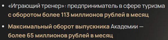 Руководитель компании ООО «Новоспейс» утверждает, что выпускники школы зарабатывают от 100 000 рублей в месяц. Их ежемесячные торговые обороты достигают 65 000 000 рублей. Сам туристический наставник имеет обороты на сумму 113 000 000 рублей в месяц.