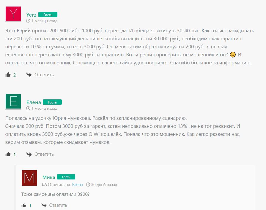 • наличие на сторонних сайтах только негативных отзывов, разоблачающих Чумакова в мошенничестве.