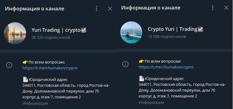 После того как предыдущие каналы в Телеграм были заблокированы, автором проекта были созданы новые: Инвестиции в CRYPTO (8 789 подписчиков) и Юрий инвестор в CRYPTO (38 204 подписчиков). На всех своих ознакомительных каналах он указывает один и тот же фейковый адрес в Ростовской области, а для дальнейшего сотрудничества предоставляет ссылку в личный Телеграм чат — https://t.me/chumakovcrypro.