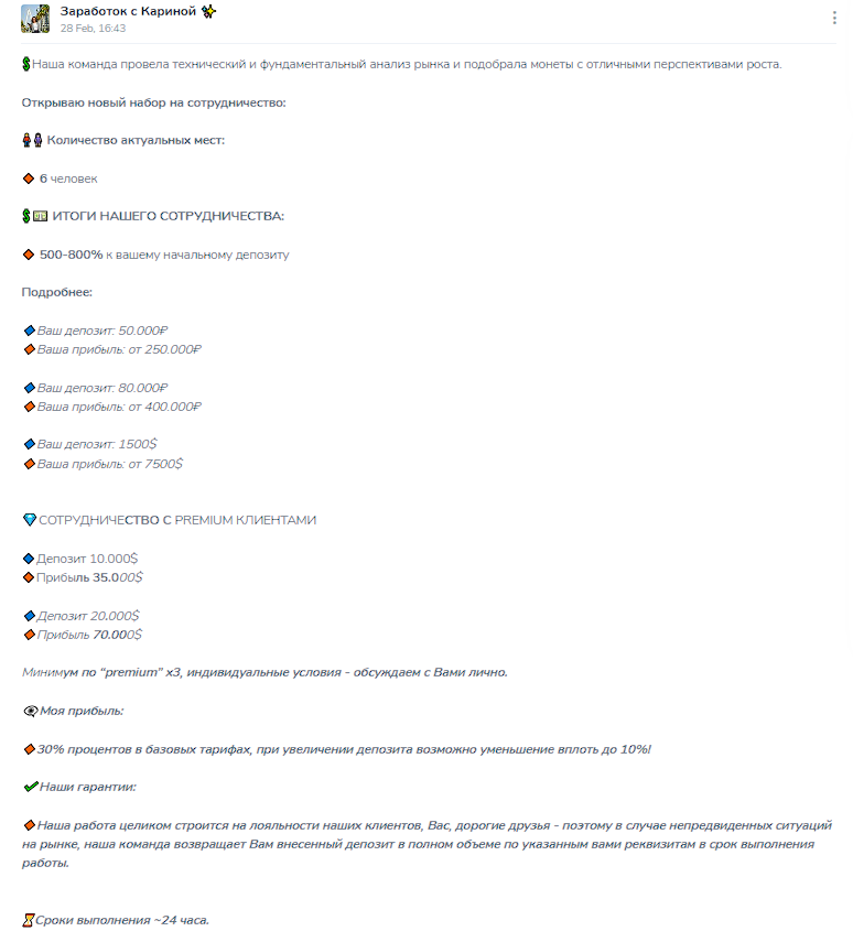 Заработок с Кариной в телеграмм канале предлагает инвестирования на условиях получения от 300% до 800% после 24 часов торговли. При этом проценты зависят от суммы вложений, которые не ограничены. Ее заработок якобы складывается из 10-30% процентов комиссионных.