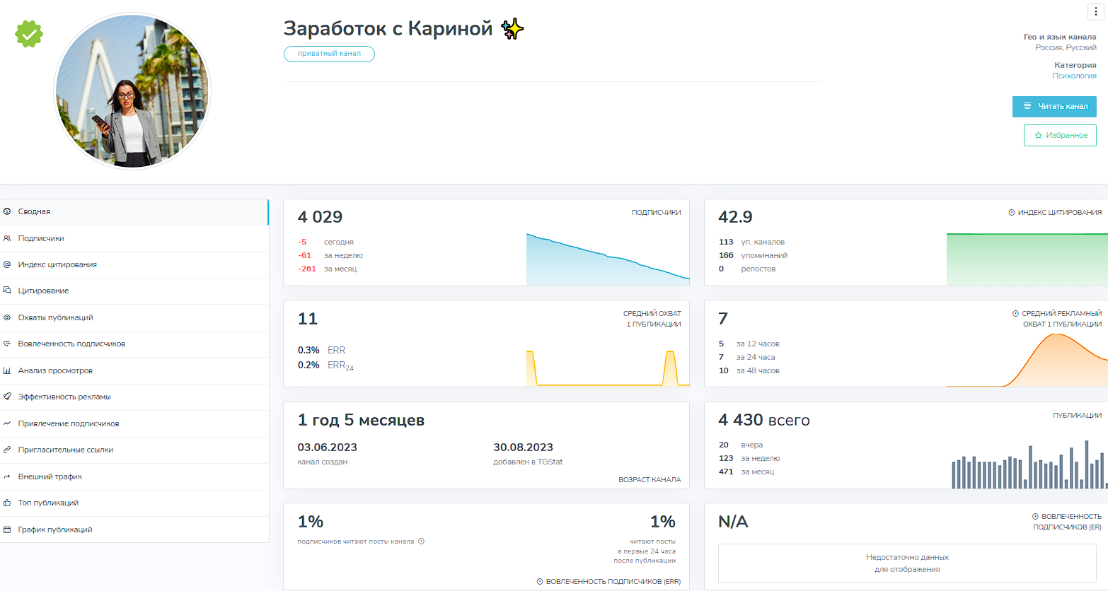 Тг канал Заработок с Кариной был создан год назад, в июне 2023, однако первые относящиеся к актуальному проекту посты были опубликованы в октябре. За все время автор собрал аудиторию в 4000 человек из которых только 1% следил за актуальными постами. Это говорит об огромной накрутке ботами.