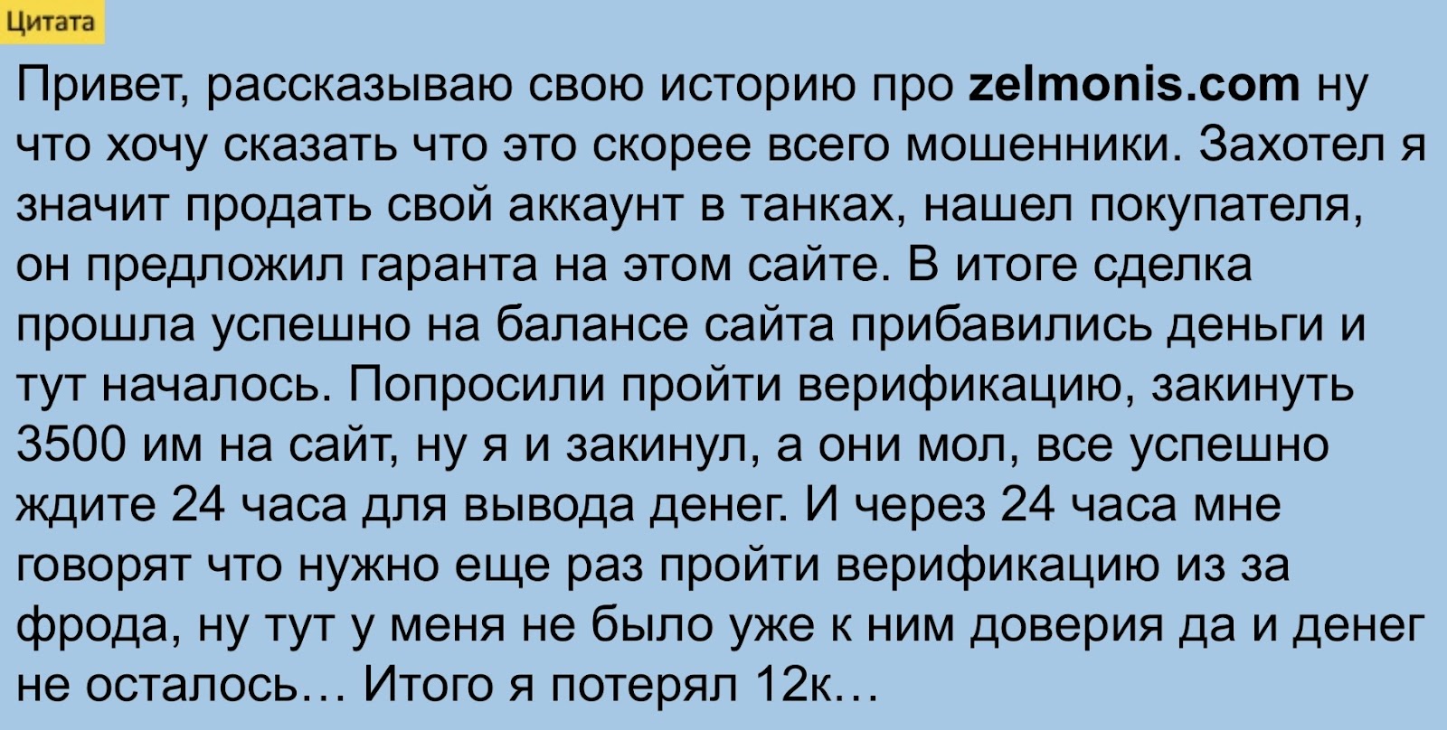 Если вы уже знакомы с компанией Zelmonis, оставьте свой отзыв о проведенных сделках под этой статьей. Расскажите, как у вас проходили платежи — не было ли задержек и устроила ли комиссия.