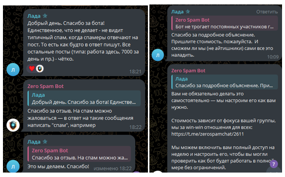 - есть платная и бесплатная версии, отдельная группа для тестов Zero Spam Bot;