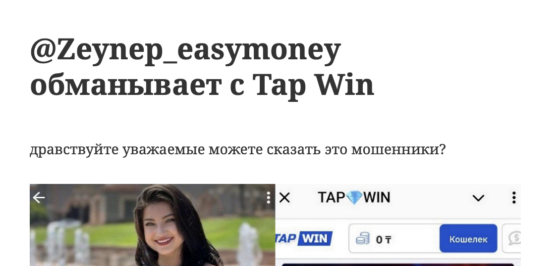 Комментариев о деятельности проекта Zeynep easymoney практически нет, зато на весь интернет известна скам-платформа Tap Win, которую она продвигает. Всех, кто агитирует зарабатывать с данным сервисом, обвиняют в продвижении scam-приложений. Пострадавшие вполне обоснованно рассматривают Tap Win как классический развод — фейковые прибыли, блокировка вывода и требования доплат.