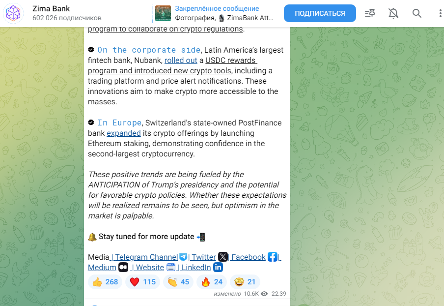 Официальный Телеграм-канал банка имеет более 600 000 фолловеров. В группе публикуются новости мира финансов, информация об обменнике. Есть Zima Bank Chat, где можно пообщаться с другими пользователями. Также компания ведет страницу zimabankofficial в Facebook и паблики в X и Medium.