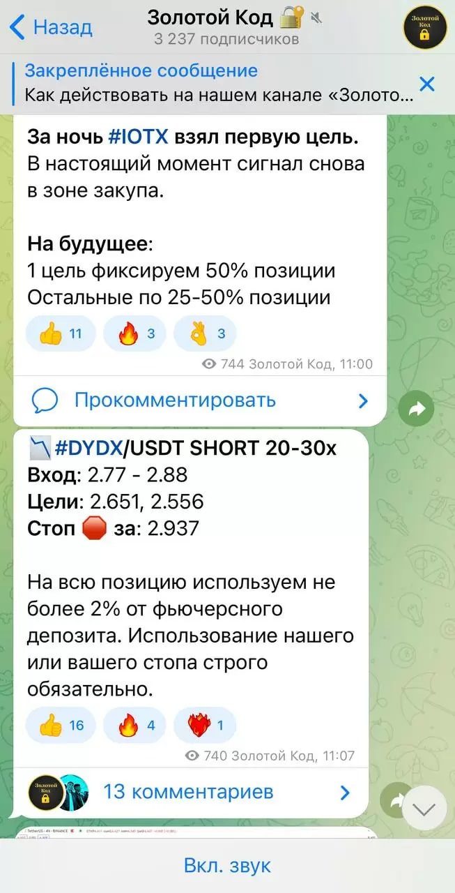 Вероятно, модератор Телеграм-канала Золотой Код криптовалюта является непрофессионалом и не обращает внимание на то, какие проекты он рекламирует. Из-за отсутствия публикации статистики проходимости сигналов от этого трейдера, невозможно оценить их качество. Поэтому, оплачивать доступ в закрытый чат не имеет смысла, содержимое его вряд ли будет отличаться от бесплатного контента.