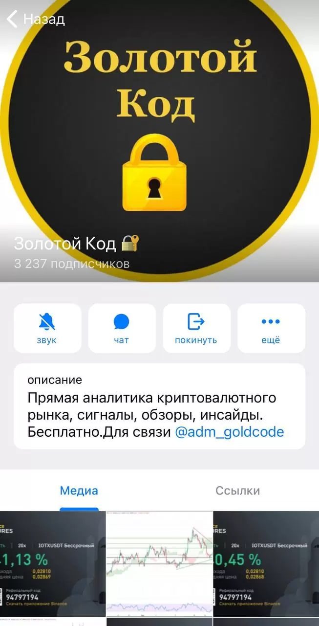 Администратор канала иногда делает репосты новостей и размещает графики изменений стоимости популярных криптовалют, но аналитика на канале оставляет желать лучшего. К тому же, трейдер не объясняет свои выводы по той или иной ситуации.Спекулянт @adm_goldcode не предлагает платных услуг и не демонстрирует статистику своих сделок, что затрудняет оценку качества его сигналов. Его канал явно не подойдет для начинающих трейдеров. В последнее время на канале преобладает реклама сомнительных проектов, содержащих реферальные ссылки. Некоторые из партнеров трейдера являются мошенниками и предлагают клиентам фейковые токены, которые никогда не смогут принести прибыль.