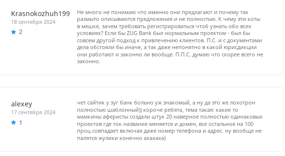 Отзывы о Zug bank в сети негативные. Пользователи считают, что это очередной лохотрон – клон мошеннических проектов. По их словам, на это указывает отсутствие лицензии и информации о собственнике, руководстве компании. Также они делают акцент на размытости предложений, отсутствии юридической документации. Они советуют не связываться с этим сервисом, так как он вызывает серьезные подозрения.