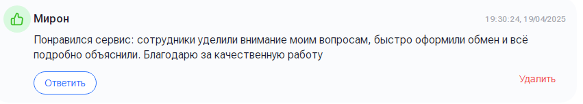 - Качественная клиентская служба: менеджер всегда остается на связи в ТГ и координирует процесс обмена.