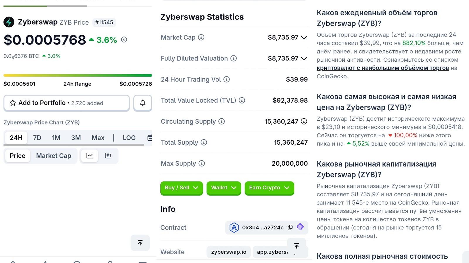 Из актуальных данных на 09.01.2026 года о токене ZYB:- стоимость — 0.0005768 долларов;