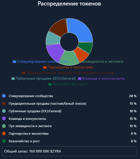 Площадка планирует создать собственную крипту. Всего планируется выпустить 160 млн. токенов $ZYRA. Они будут распределены следующим образом: