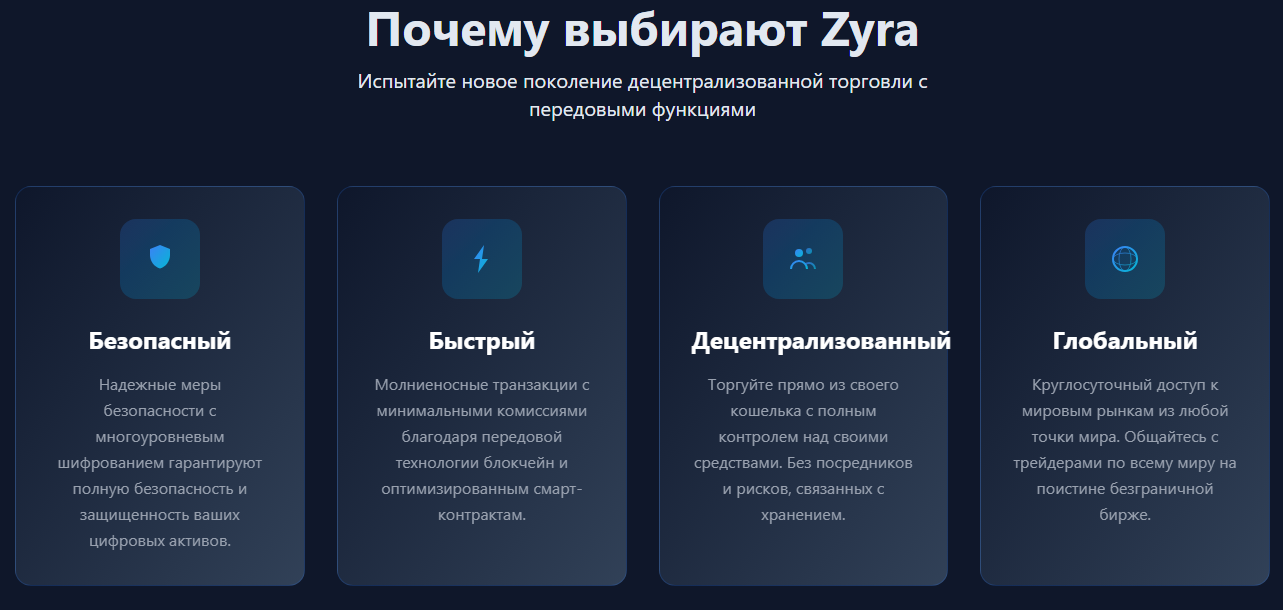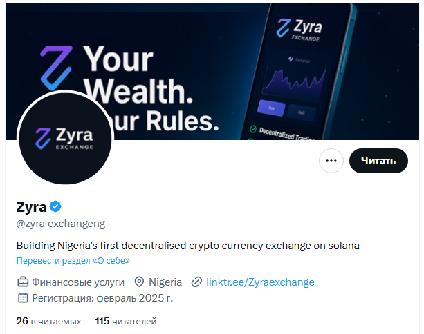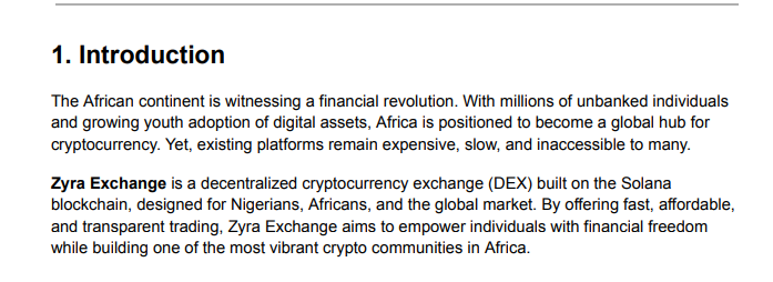 В «белой книге» проекта сказано, что Zyra Exchangeng ориентирована на жителей Нигерии и других стран африканского континента. Работа биржи построена на блокчейне Solana, а основная цель — дать финансовую свободу жителям Африки.