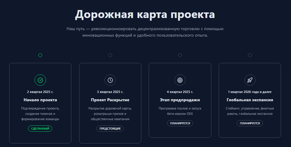 Согласно опубликованной на сайте zyraexchange com «дорожной карте», в четвертом квартале 2025 года начнется пресейл токенов и запуск бета-версии DEX. В первом квартале 2026 года создатели планируют добавить новые функции: стейкинг, управление личным кабинетом, фиатные активы.