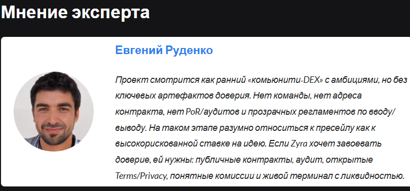 Так как платформа появилась в августе 2025 года, в интернете пока нет реальных отзывов от пользователей. Однако нам удалось найти мнение эксперта Евгения Руденко, который уже успел изучить проект. Он высказался критически, отметив, что «Зайра Эксчендж» выглядит довольно рискованно и пока не внушает доверия из-за отсутствия конкретных действий ее создателей