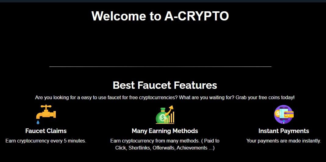 Команда A Crypto Faucet утверждает, что предоставляет множество возможностей для заработка криптовалюты. Для этого пользователи могут просматривать рекламные материалы или решать капчи. Награды в форме токенов начисляются каждые 5 минут при активности на сайте.
