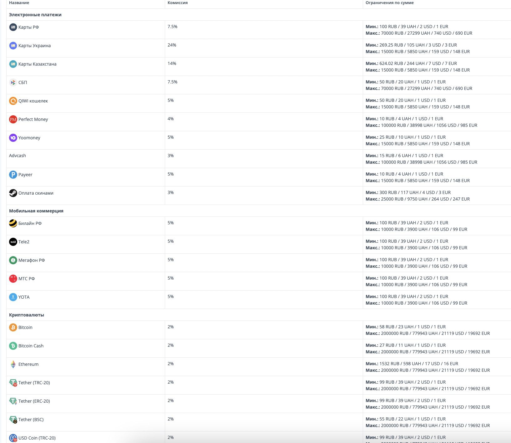 Поддерживается более 30 платежных систем. Для карт РФ и СНГ действуют высокие комиссии: 7,5% для карт России, 24% — Украины, 14% — Казахстана. Для электронных кошельков и мобильных платежей комиссия составляет 5%, для криптовалют — 2%.