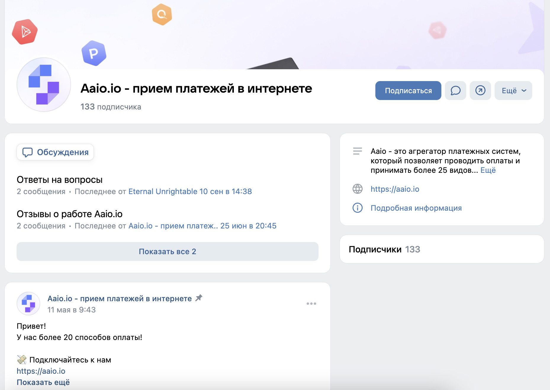Присутствие в соцсетях минимальное: 136 подписчиков в Telegram канале https://t. me/aaio_io, 133 во ВКонтакте группе https://vk.com/aaioio, 4 в TikTok аккаунте https://www.tiktok.com/@aaio_io. Отзывов об aaio payment нет вообще.