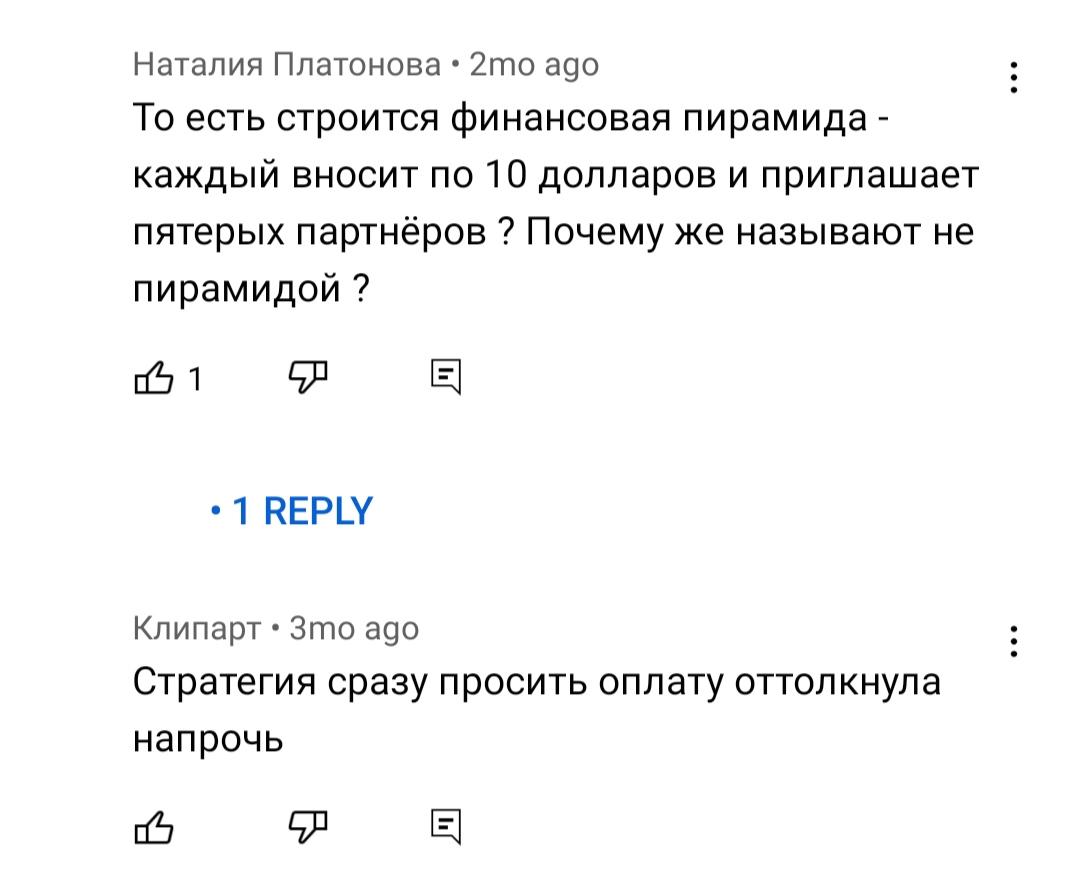 Все это необоснованные обещания, и даже в отзывах про Alny клиенты не могут высказать положительное мнение про сотрудничество. Стоит узнать реальный способ заработка на данной платформе. И он заключается в следующем: пользователь делает минимальный вклад 10 долларов и приводит 5 человек, которые также вкладываются в проект. Затем они вовлекают еще по 5 человек, и каждый получает процент от прибыли партнера. Вот и все, на самом деле Олни проект — обычная финансовая пирамида.