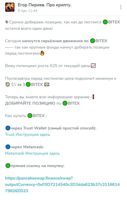 Егор Пириев, который продвигает токены ATF и Bitex, обвиняется в мошенничестве. Он утверждает, что обладает конфиденциальной информацией, которая поможет его подписчикам озолотиться, но пользователи, попавшие на его уловки, считают канал Telegram «Про Крипту» скамом.
