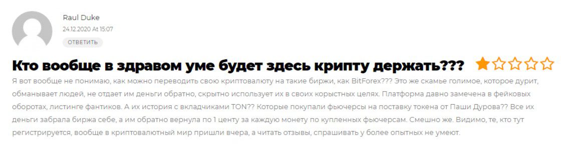 Мы не смогли найти отзывы о Криптобанке на тематических форумах, и это логично. Скорее всего, первые отклики появятся после 1 июля, когда старта официальной продажи токена так и не случится. Но учитывая то, что регистрацию клиент должен пройти на платформе BitForex, мы решили проанализировать отзывы на эту биржу. В своих многочисленных комментариях люди пишут, что ВитФорекс разводит своих клиентов, не выводит деньги и участвует в листинге коинов-пустышек.