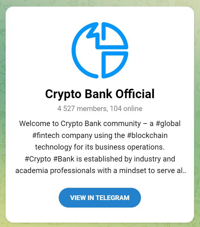 Проект позиционируется на веб-сайте https://www.crypto-bank.io/, дата создания которого — 13 апреля 2020 года. Сайт — простой одностраничник неплохого качества, насыщен информацией, побуждающей пользователя к сотрудничеству.