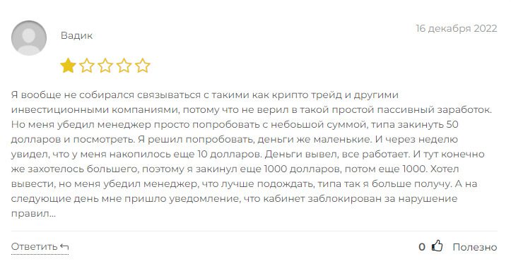 В интернете существуют несколько разоблачений этой компании. Пострадавшие инвесторы оставляют свои отзывы, в которых сообщают, что они не смогли вывести свои средства с платформы данного сайта. Кроме того, существуют экспертные обзоры, в которых этот проект называется скамом.