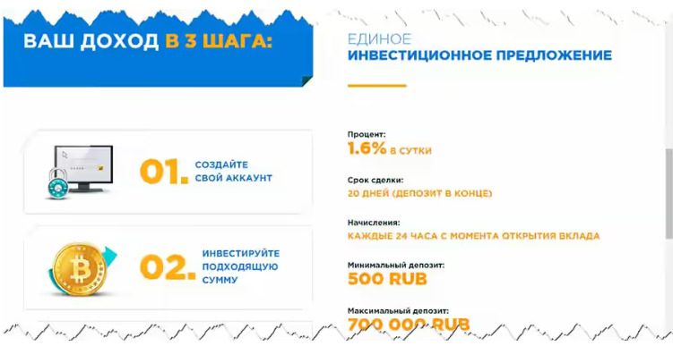 Crypto Finance Crypto – высокодоходный хайп, маскирующийся под международный криптовалютный фонд. Проект обещает ежедневную доходность по инвестициям в размере 1,6%. Модераторы утверждают, что пользователи могут получать до 100% прибыли от своего депозита каждый месяц, при условии активного привлечения рефералов. Однако все это обман. Постоянные выплаты в таких объемах невозможны при честном трейдинге. Компания не обладает лицензией, а информация о руководстве отсутствует.