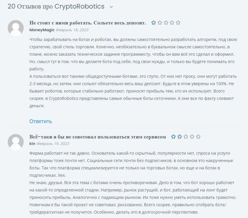 Но существуют и негативные отзывы от пользователей, которые утверждают, что они понесли убытки, приобретая бесполезные роботы на этой платформе. Они выражают свое недовольство и сожаление по поводу слитых депозитов и недополученной прибыли.