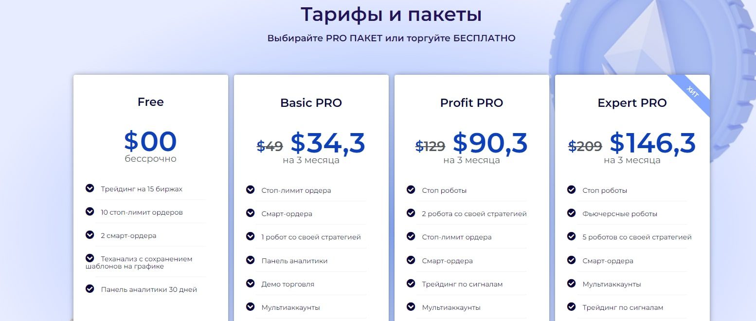 1. Basic PRO за $34.3. Предоставляет инструменты для торговли криптовалютами, включая стоп-лимит ордера и смарт-ордера.
