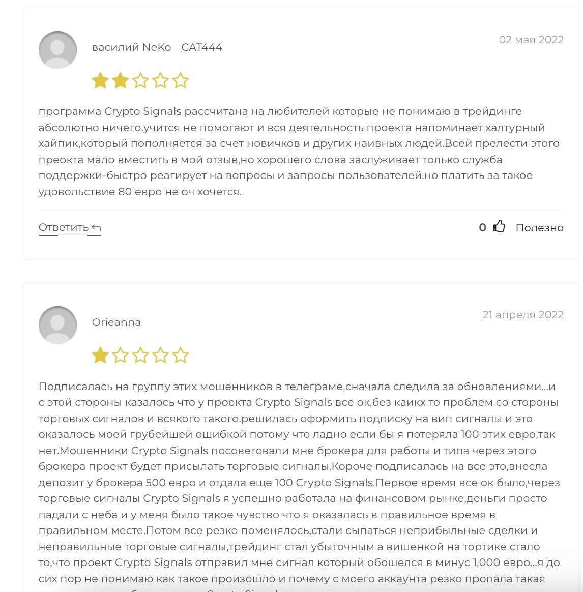 На сайте cryptosignals отзывы предоставлены без ссылок на их авторов. Просто стоковые фотографии из сети и к ним машинно сгенерированный текст фейковых отзывов. Причем ни одного русскоязычного отзыва нет.