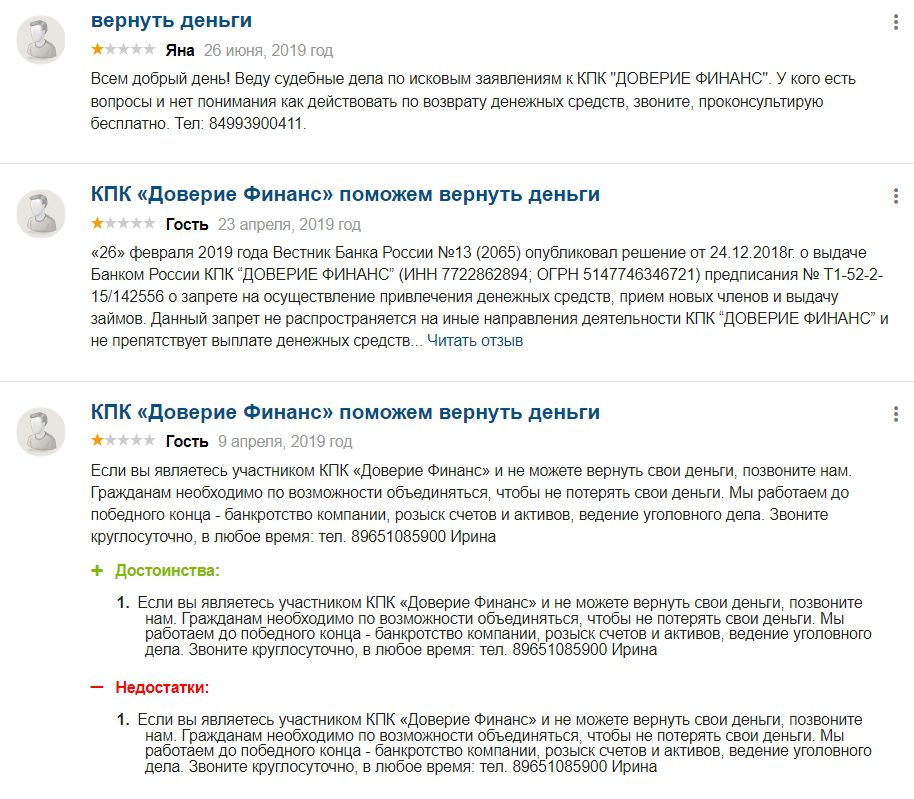 Внимание: на данный момент многие обманутые вкладчики через суд разбираются с КПК Доверие Финанс. Об этом сообщается на разных каналах и официальных сайтах. Поэтому рекомендуется присоединиться к разбирательству, если вы стали жертвой этого проекта.