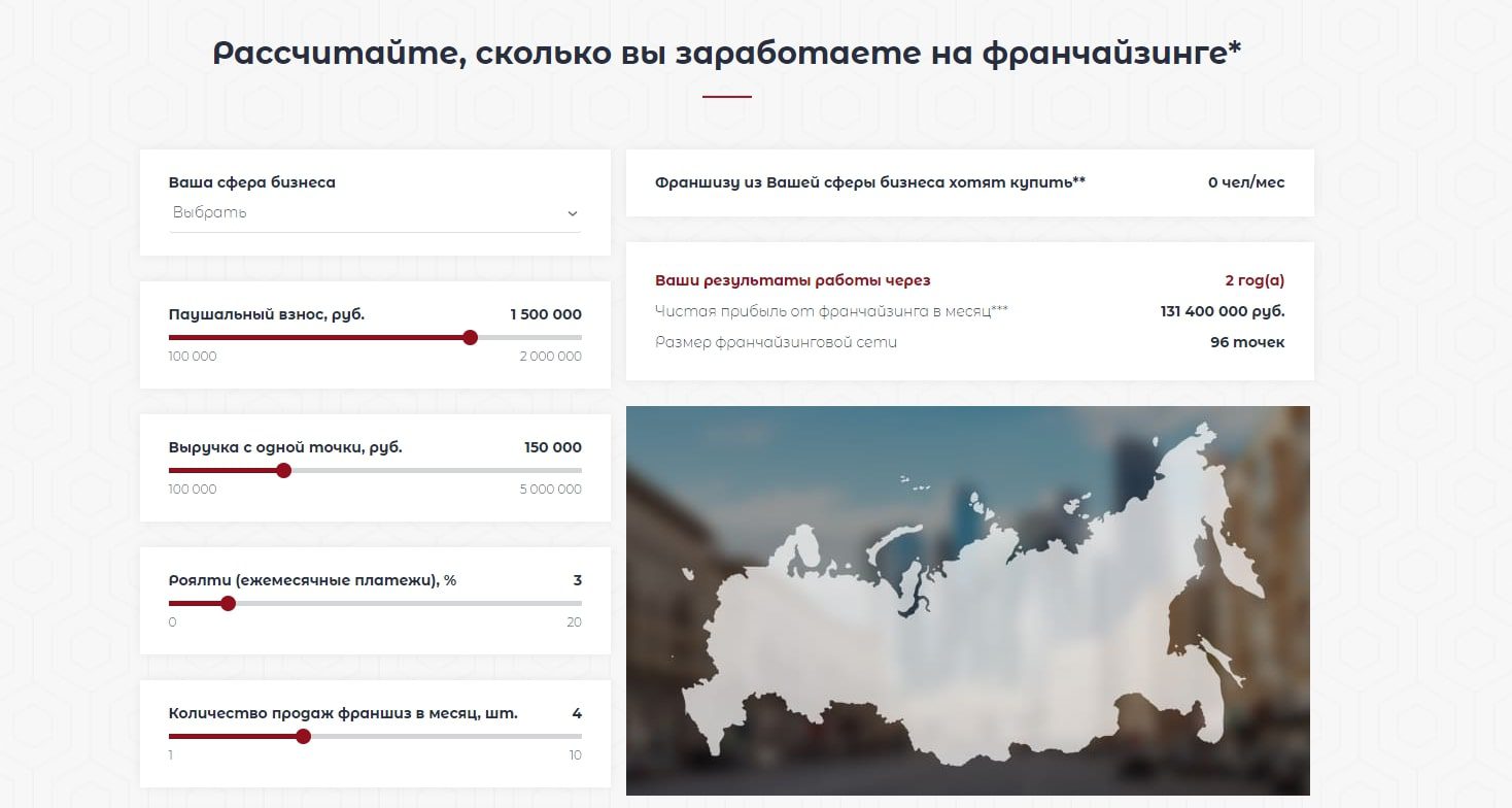 Чтобы завлечь новых инвесторов на сайте компании Франчайзинг Плюс оформлен калькулятор прибыли, где все желающие могут увидеть свой заработок в зависимости от суммы стартового депозита.