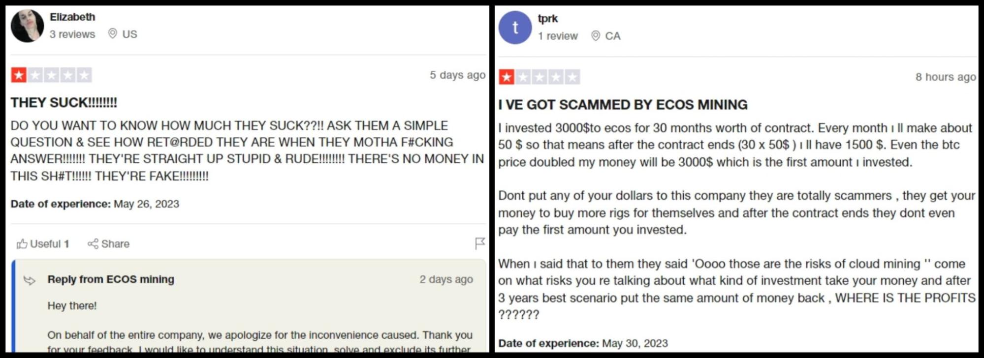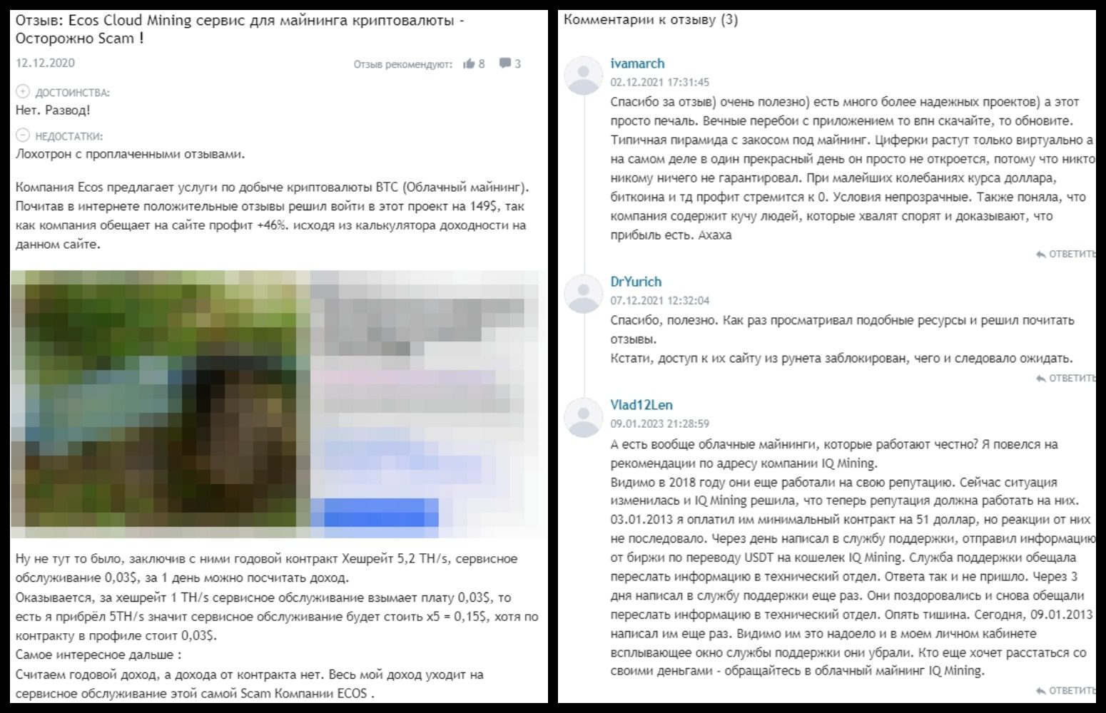 Сайт облачного майнинга ecos.am с 2021 года проходит в ЦБ РФ финансовой пирамидой, что подтверждается откликами других недовольных клиентов. Для поддержания позитивного имиджа применяются заказные отзывы об ECOS Cloud Mining по схожему шаблону, что также упоминается в комментах о липовом проекте для заработка на крипте.