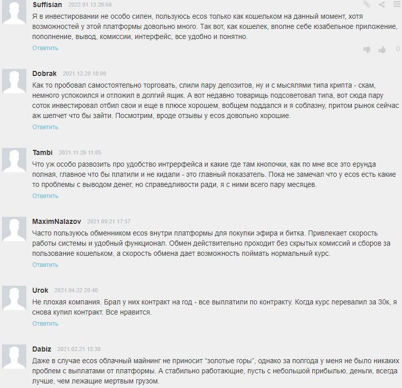 Отзывы клиентов о площадке Ecos МайнингОтзывы клиентов о площадке Ecos Майнинг