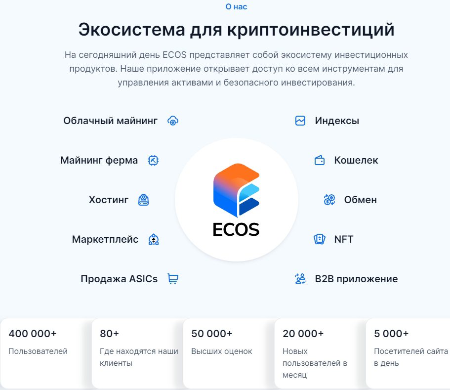 ECOS Майнинг — экосистема интернационального уровня, якобы позволяющая зарабатывать на цифровых активах всеми известными способами. Единственный недоступный — вложения в NFT-токены на торговых ботах, однако рассчитывать на этот и другие варианты получения профита не стоит.