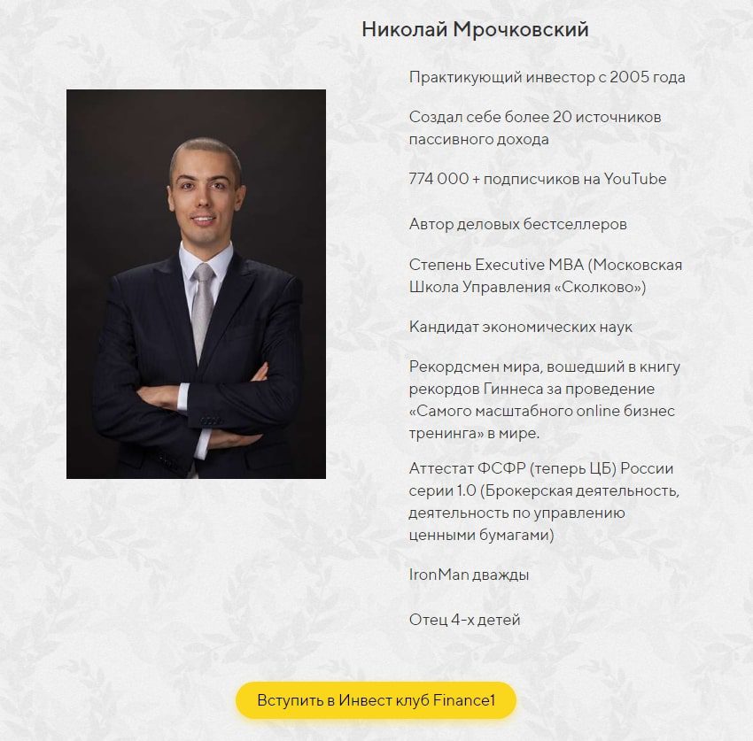 Финанс 1 – платформа для обучения заработку на инвестициях, которая позиционируется как клуб единомышленников. Участникам предоставляются доступ к авторским курсам создателя платформы, а также возможность получать консультации для успешного старта. Также в рамках проекта проводятся вебинары, на которых инвестор Николай Мрочковский разбирает различные аспекты инвестирования. В этой статье вы узнаете, почему стоит относиться к данному проекту скептически и не тратить на него свое время.