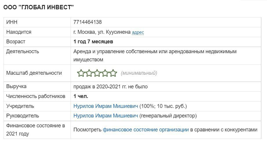 Мы проверили информацию о регистрации фирмы. Она подтвердилась. Имрам Нурилов действительно является владельцем ООО «ГЛОБАЛ ИНВЕСТ». Ее основным родом занятий указано управление арендованной или собственной недвижимостью.