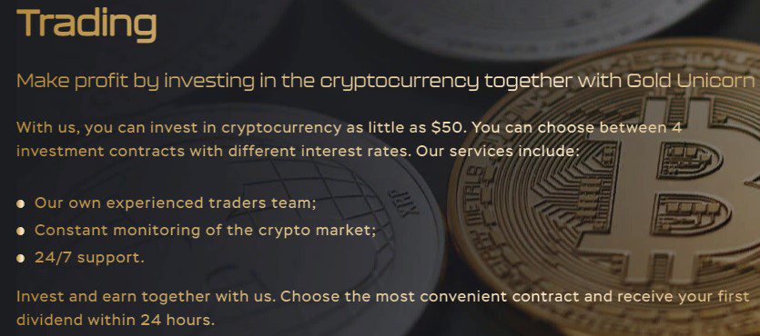 Под это дело и собирает деньги с инвесторов. Обещает им доход то ли от криптотрейдинга, то ли от энергетики. Представлены 4 тарифа для инвесторов с разной состоятельностью. Минимально предлагает вложить $50 под 1% ежедневно. Самый большой процент обещает за депозит от $10 тысяч, его обладатели якобы получат по 2% в день. На словах гарантируют безопасность, защиту и страховку инвестиций. Переводы Gold Unicorn принимает только в криптовалюте.