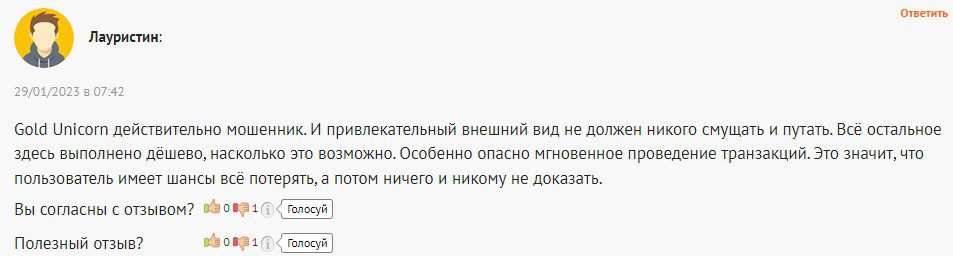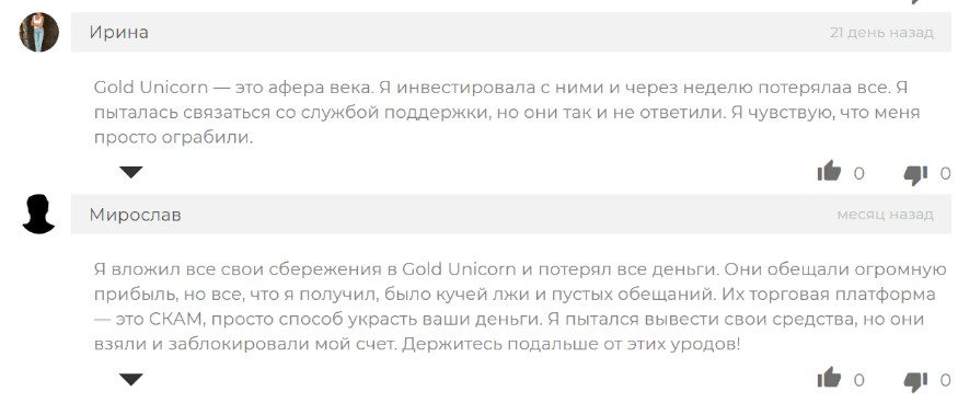 В сети о работе проекта уже есть отзывы, Gold Unicorn в них называют мошенниками. Пострадавшие повелись на красивый сайт и поверили в серьезность компании.
