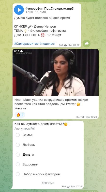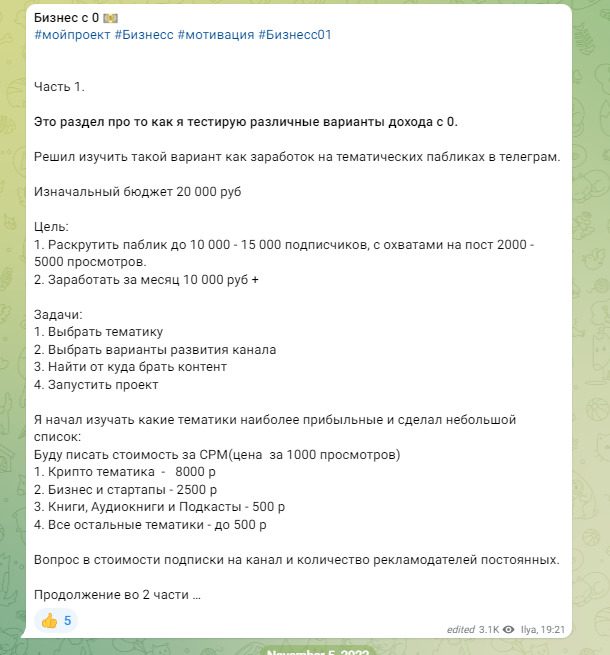 Сбор статистики не увенчался успехом, Илья не смог вести учет расходов и прибыли. Пытался заработать на всем, хватался за автоматизированную торговлю с прибыльностью от 30 и более процентов в месяц, раскрутку Телеграмм каналов для заработка на рекламе, созданию Телеграмм биржи вакансий, инвестирование в покупку с дальнейшей перепродажей красивых Телеграмм адресов. Последние посты — обучение продажам. Много мотивационных постов, аудио подкастов и видео со знаменитостями. Большая часть публикаций не являются авторскими, а в целом контент не имеет практической пользы.