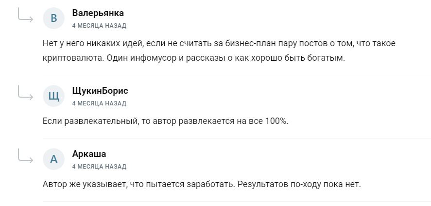 Илья не смог собирать статистику вложений, считать полученную прибыль. Даже о своих планах больше аудитории не рассказывает. Проект по автоматизированной торговле представлен не был. Бот знакомств есть, но не работает. Раскрутка канала успехом не увенчалась, до 10-15 тысяч автор не дошел, а охватов 30% в канале и близко нет. С другими проектами произошло то же самое — Илья забросил все начинания. Автор уверяет, что быстро теряет интерес ко всему, но причина кроется в поверхностном изучении тематики и неумении доводить дело до конца.
