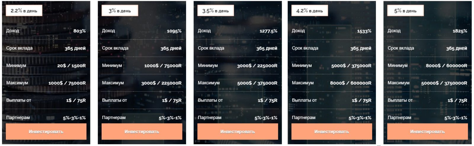 Компания АО «Инвест Про» предлагает несколько тарифных планов, которые отличаются доходностью и минимальной суммой вклада. К примеру, чтобы получать 2.2% доходности в сутки, достаточно вложить 20 долларов на 365 дней. Таким образом выходит, что доходность за год составляет 803%. Минимальная сумма для вывода составляет 1 доллар.