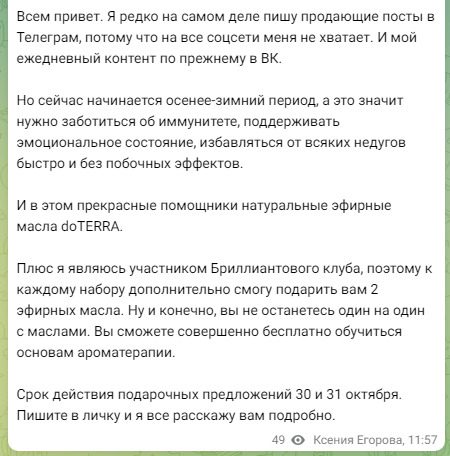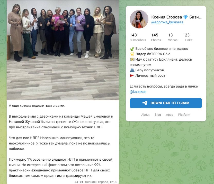 Ксения Егорова Инвестиции – Telegram-канал с 143 подписчиками, посвященный тематике многоуровневого маркетинга. Автор канала выкладывает материалы, в которых она описывает свой прогресс в компании, и активно строит команду рефералов для участия в проекте doTERRA Gold. Лента наполнена цитатами из известных мотивационных книг, причем Ксения Егорова часто обращается к мыслям Харва Экера. Проект doTERRA Gold, с которым сотрудничает Егорова, является финансовой пирамидой.