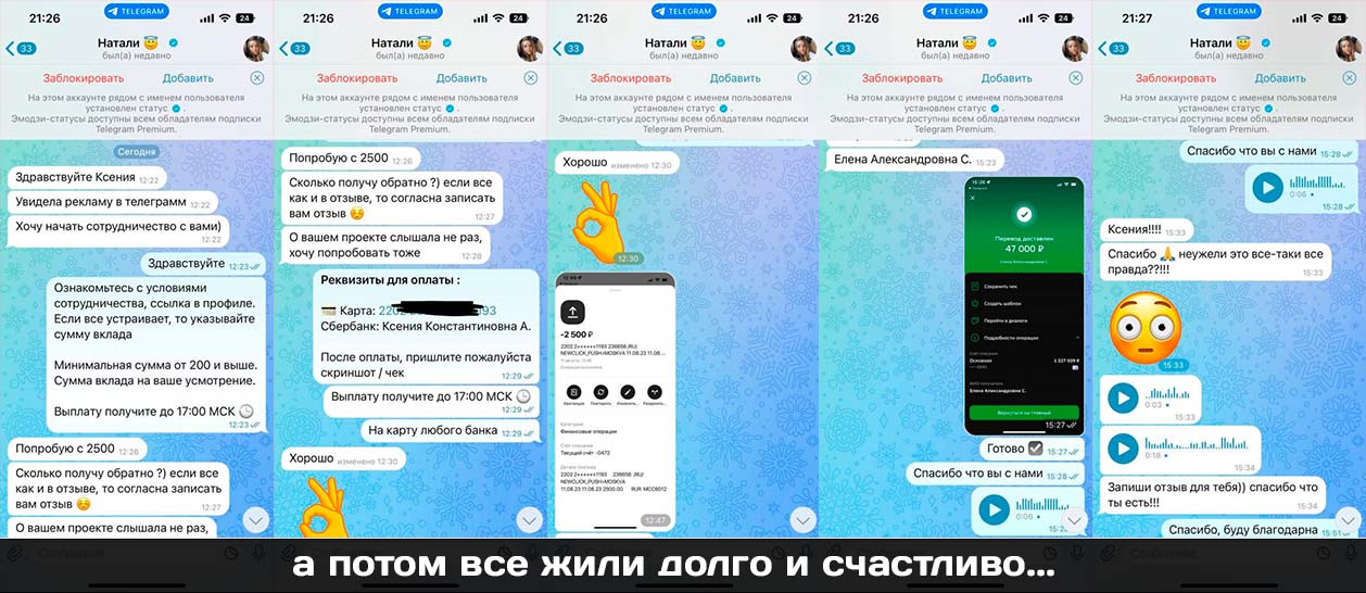 • Автор канала постоянно публикует информацию о том, как она перевела огромную сумму денег очередному партнеру, но скриншоты явно сфальсифицированы.