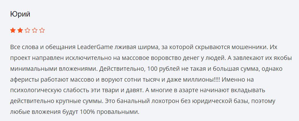 На сторонних ресурсах мы нашли о платформе Leader Game отзывы негативного характера, где пользователи четко и конкретно приводят доводы того, что анализируемая компания является финансовым лохотроном.
