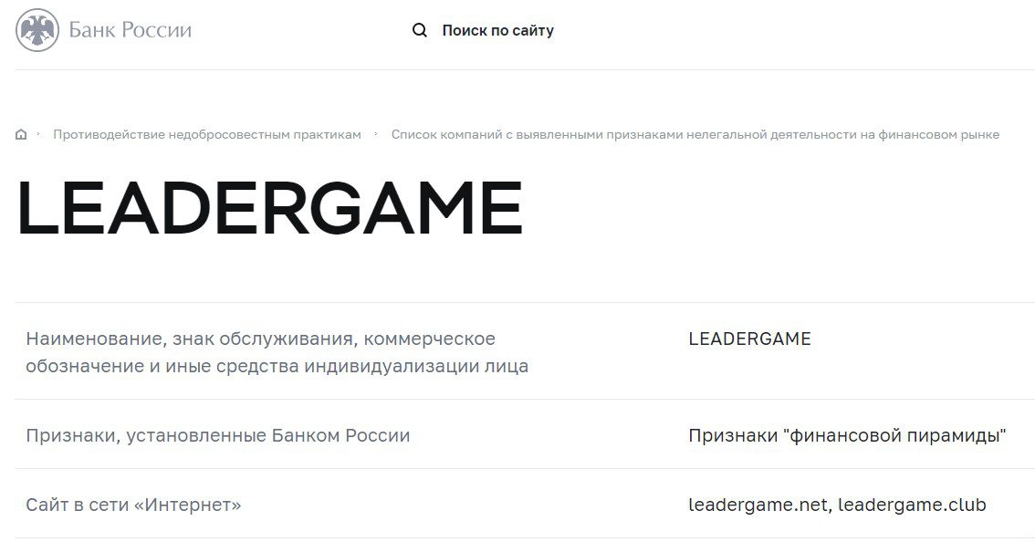 Согласно отзывам о LeaderGame, компания занимается мошенничеством. Изучая официальный ресурс ЦБ РФ, был обнаружен тот факт, что LeaderGame находится в черном списке финансовых мошенников.Кроме этого, компания не имеет официальной регистрации, то есть правоохранительные органы даже не смогут отыскать субъекта, к которому можно будет предъявить претензии пользователей.