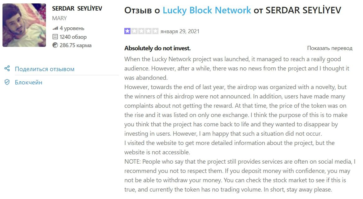 Англоязычные пользователи Lucky Block жалуются на бесперспективность проекта и обман со стороны разработчиков. Отзывы появляются редко и в основном касаются предыдущих фейковых розыгрышей.