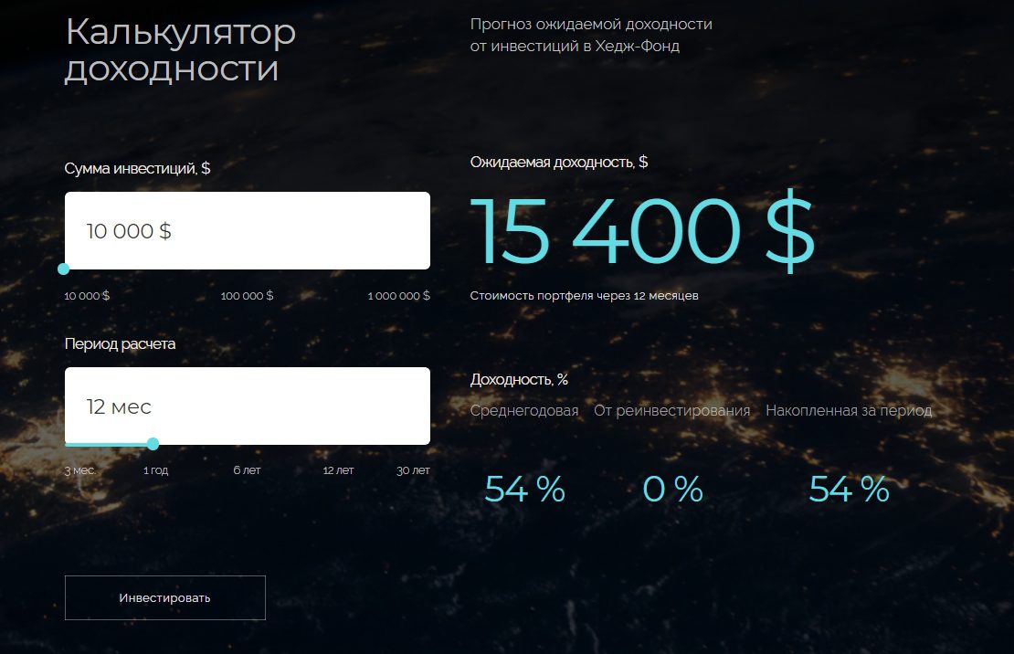 На сайте представлен калькулятор доходности, который предоставляет примерный подсчет прибыли в зависимости от суммы инвестиций. Если внести 10 000$, то стоимость портфеля через 12 месяцев составит 54000$, в среднем годовая доходность – 54%. Стратегии фонда – это инвестиции в перспективные инновационные компаний и секторов: