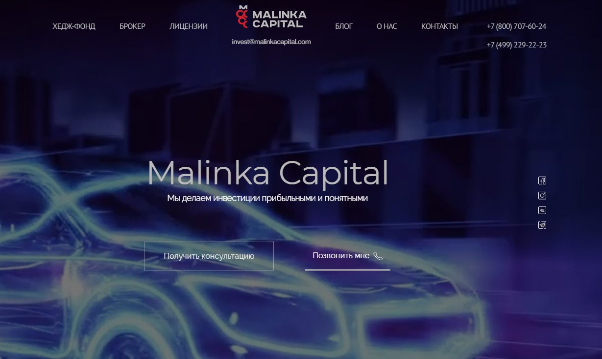 Malinka Capital – это платформа, основатели которой утверждают, что непрерывно собирают и анализируют многообещающие, инновационные и инвестиционные возможности. Руководители утверждают, что они опытные эксперты по торговле акциями, фьючерсами, опционами. Услуги организации: