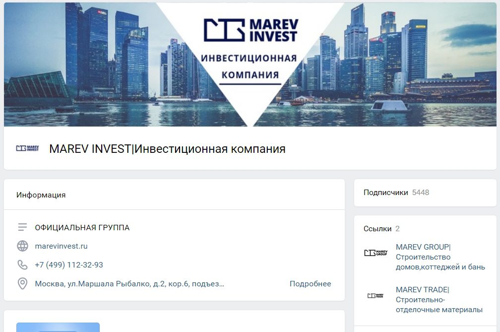 Официальный сайт проекта Марев Инвест заблокирован хостинг-провайдером. Поэтому информацию о компании мы почерпнули из сторонних источников и социальных сетей.